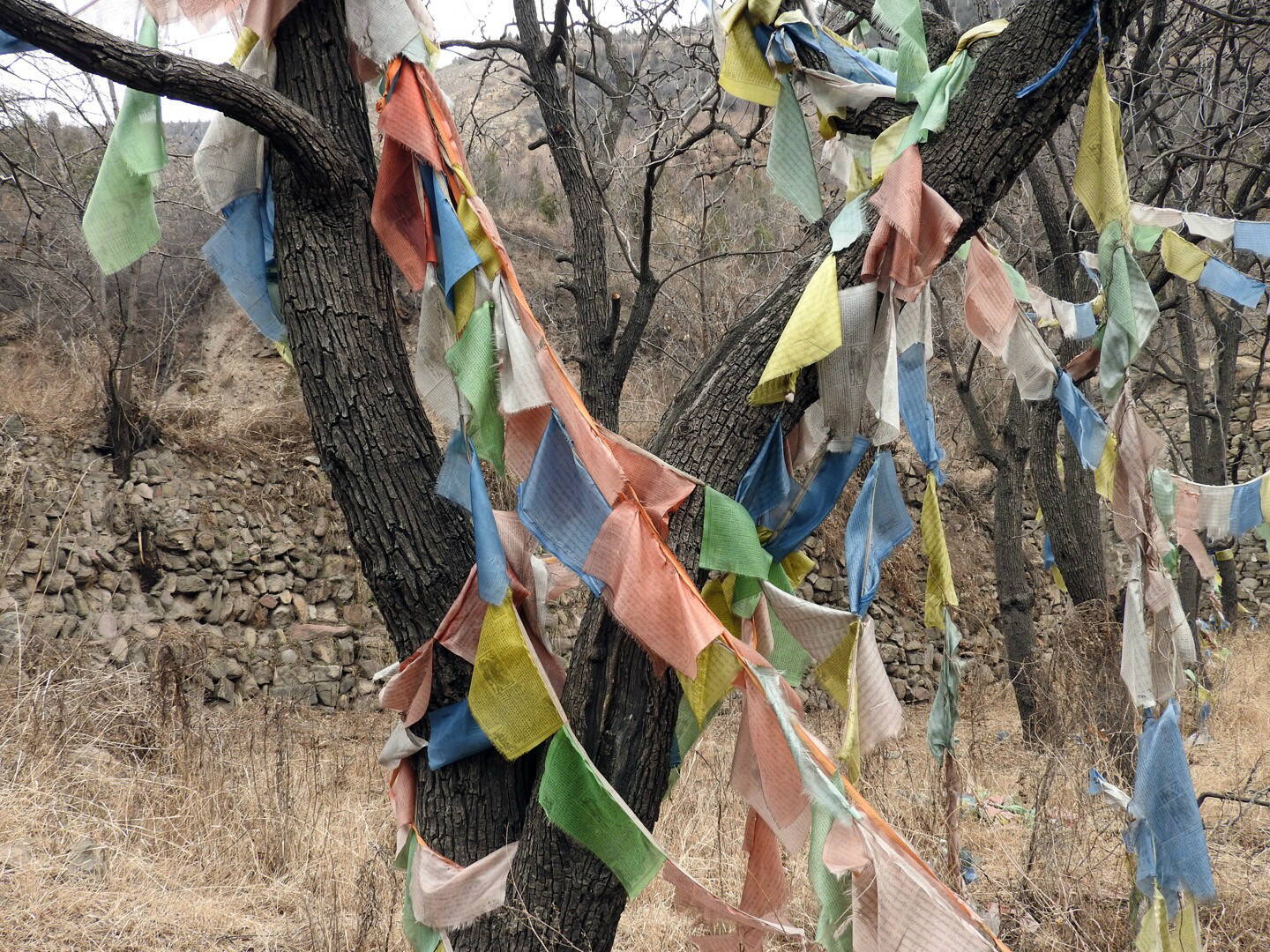 Кое-где на деревьях висят гирлянды из флажков. Это какие-то предметы культа - все тряпочки покрыты иероглифами.